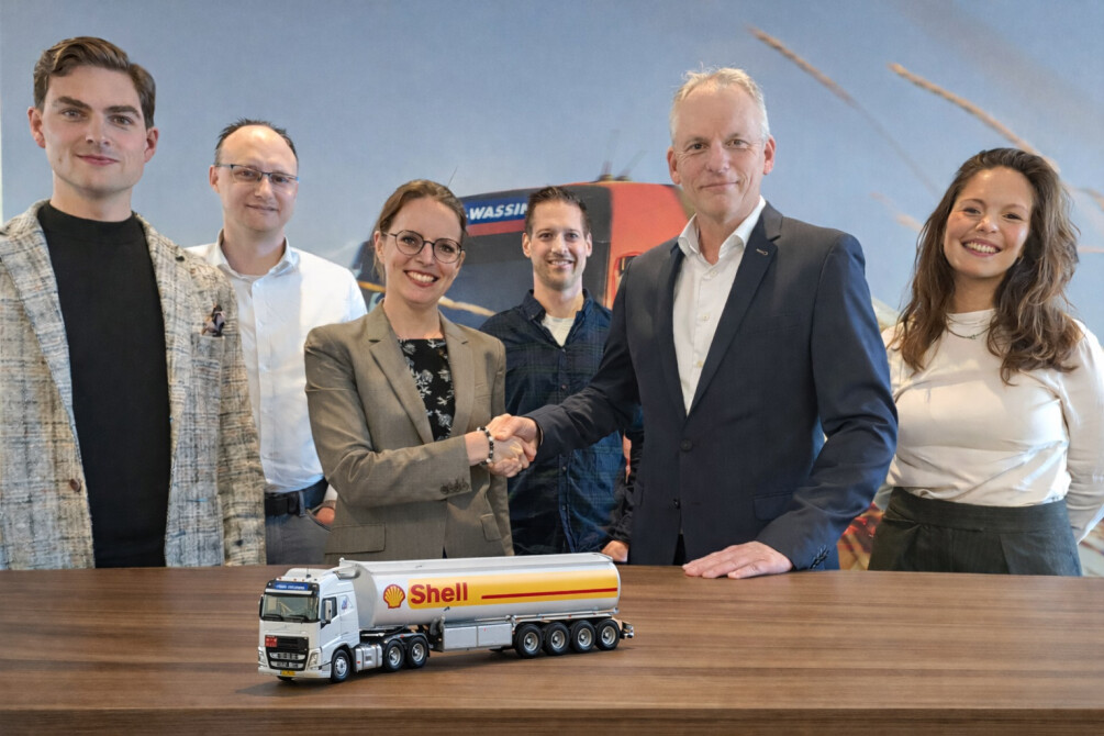 Jurriaan Seppenwoolde (Commercial Manager Fuel Logistics Nijhof-Wassink), Jan Meuleman (Operations Manager Fuel Logistics Nijhof-Wassink), Coleta Free-Cranenburg (Business Opportunity Manager Benelux Road Transport Strategy Shell), Freek Gieles (Contract Manager Road Transport BeNeLux Shell), Bertil Bouwhuis (Managing Director Nijhof-Wassink) en Josephine Dattatreya Andela (Supply Chain Lead Downstream Logistics Europe Shell)